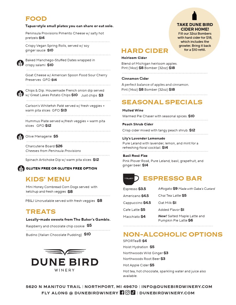 Dune Bird is a relaxed and friendly place to enjoy wine, hard cider, espresso bar, non-alcoholic beverages, and light eats! Explore our offerings…Take a peak at our Tasting Menu and Food Menu. Dogs are welcome in our outdoor spaces—just keep them on a leash and by your side as you relax and take in the views.